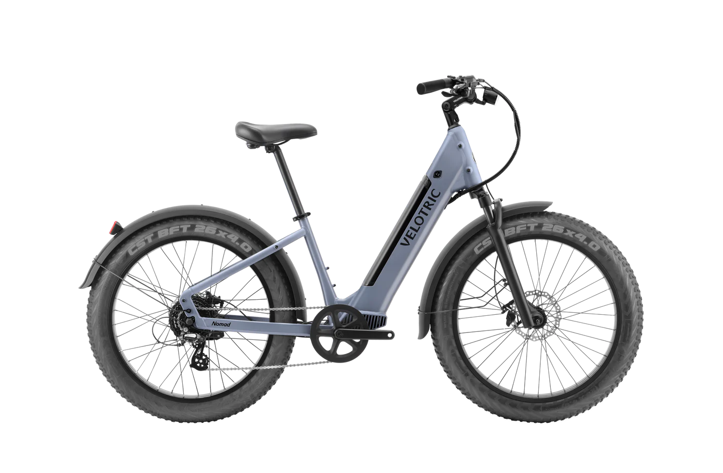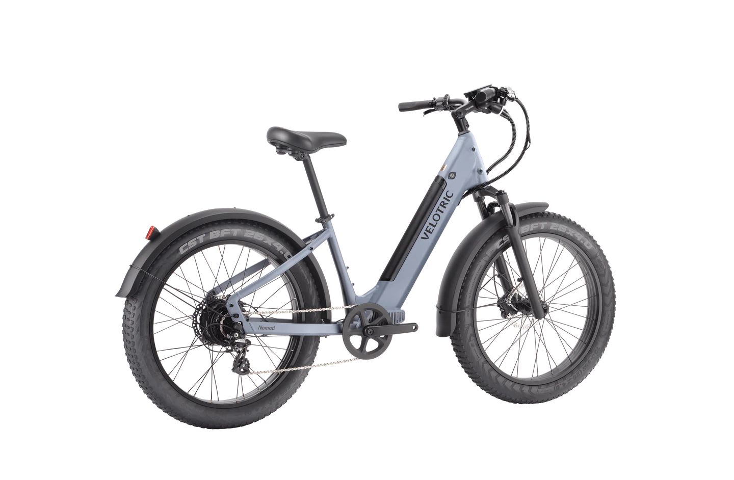 “Mighty Performance MotorThe 750W high-performance motor with 75Nm torque brings strong terrain-conquering abilities, surpassing most competitors.Range Up to 55 MilesNomad 1 Plus’s UL-certified battery promises an impressive range up to 55 miles while staying water-proof.Hydraulic BrakesNomad 1 Plus is equipped with premium hydraulic brakes, offering finer & more powerful control for your riding experience.Comfort, MAXIMIZEDSpeed with the handlebar adjusting up to 60 degrees while the 80mm suspension fork reduces the bumpiness of your ride. Enjoy the comfort.Conquer any Terrains, Effortlessly. The Velotric Nomad 1 Plus is built for any adventure, handling heavy loads, steep hills, and harsh weather. With a 750W powerful motor and the max load capacity of 440 Lbs, it offers powerful momentum and effortless riding, even on 15-degree inclines.Go anywhere you want. Like a Nomad. The Nomad 1 Plus is your go-anywhere adventure bike. With a powerful 750W motor and 75Nm torque, it conquers any terrain, while the 691Wh battery offers up to 55 miles of long-lasting rides.Riding comfort, maximized. Your adventures deserve comfort. The Nomad 1 Plus offers both step-over and step-thru designs for accessibility, an 80mm suspension fork to reduce bumps, and powerful hydraulic brakes for full control.Ride with peace of mind Our bike and battery are UL certified, tested over 150,000 times under extreme conditions, so you can ride worry-free. The Nomad 1 Plus also features a rear light and waterproof hydraulic brakes for added safety in any conditions.Adjustable StemAn adjustable stem was added to Nomad 1 Plus: enabling you to customize your riding position and ride more comfortably.Brighter Front LightThe Nomad 1 Plus front light now shines brighter at 60 Lux, enhancing safety with increased visibility.Speed RangeIts max speed adjustable range is now 12-28mph, so you can switch from Class 1 to 3 easily!Power meets precision “With Amazing Features Like The Suspension Fork & A Powerful 750W Motor, It’s My New Go-To Ebike!”Conquer any terrains “The Nomad 1 Plus Has Such A Powerful Motor & Torque That It Conquers All The Hills In My Area Easily.”Made for heavier riders “It’s Got Everything I Ever Wanted: A 440Lb Payload, A 750W Motor, And Tires That Help Me Navigate Anywhere..Feature:Motor – 750WMax Load – 440 LbsMax Range – 55 MilesTop Speed – 28 MPH”Embark on endless adventures with the Velotric Nomad 1 Plus Ebike—power, versatility, and comfort for every ride!””